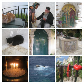 Manastirea a fost construita cam prin 1225 si inchinata Sfintei Fecioare Maria (Panagia). Mi-au placut gradinile si terasele pline de flori, plante ornamentale si ...  pisici.